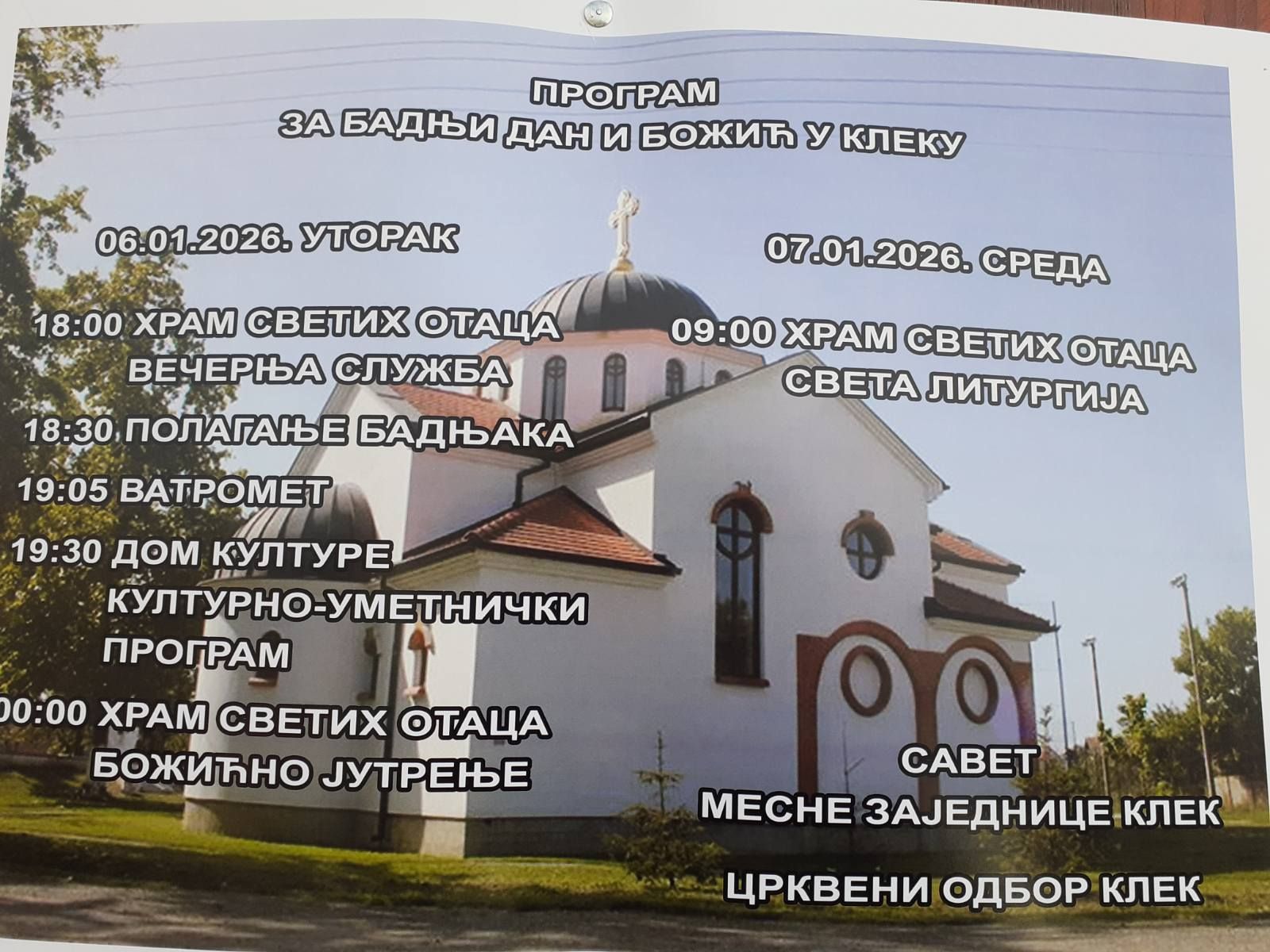 Tradicionalno, kao i svake godine, u Kleku će biti organizovan program za Badnje veče i Božić. U 18h će u Hramu Svetih Otaca biti održana Služba, polaganje Badnjaka je u 18.30h, dok je vatromet zakazan za 9.05h. Kulturno-umetnički program u Domu Kulture počinje u 19.30h, a u ponoć je Božićno jutrenje. U sredu 7. januara će u Hramu od 09h biti održana Sveta Liturgija. Organizatori su Savet mesne zajednice i Crkveni odbor Klek.