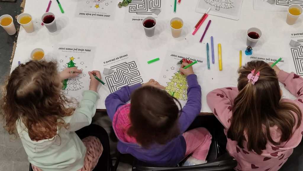 „Tom prilikom bojili smo jelke i tražili put kroz lavirint, upoznavali Kulturni centar iz nekog drugog ugla. Sa najmlađom publikom i njihovim roditeljima ispričali smo kraću priču o Kulturnom centru pokazavši tonsku, kino kabinu i projektere kao i neke kutke koji su za većinu publike nevidljivi ali veoma važni za realizaciju programa koje organizujemo. Ovom prilikom zahvaljujemo se najmlađoj publici, njihovim roditeljima i udruženju „Mapi u pokretu“ koji su prihvatili naš poziv za druženje i upoznavanje Kulturnog centra“.