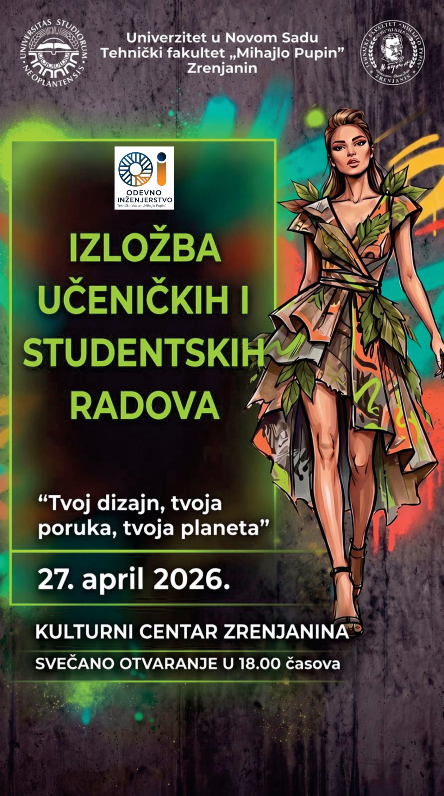 Izložba Tehničkog fakulteta „Mihajlo Pupin“ iz Zrenjanina „Tvoj dizajn, tvoja poruka, tvoja planeta“ otvara se u ponedeljak, 27. aprila u Malom salonu Kulturnog centra u 18 časova. Izložba obuhvata odabrane radove učenika srednjih škola koji su prispeli na istoimeni likovni konkurs koji je raspisao fakultet.