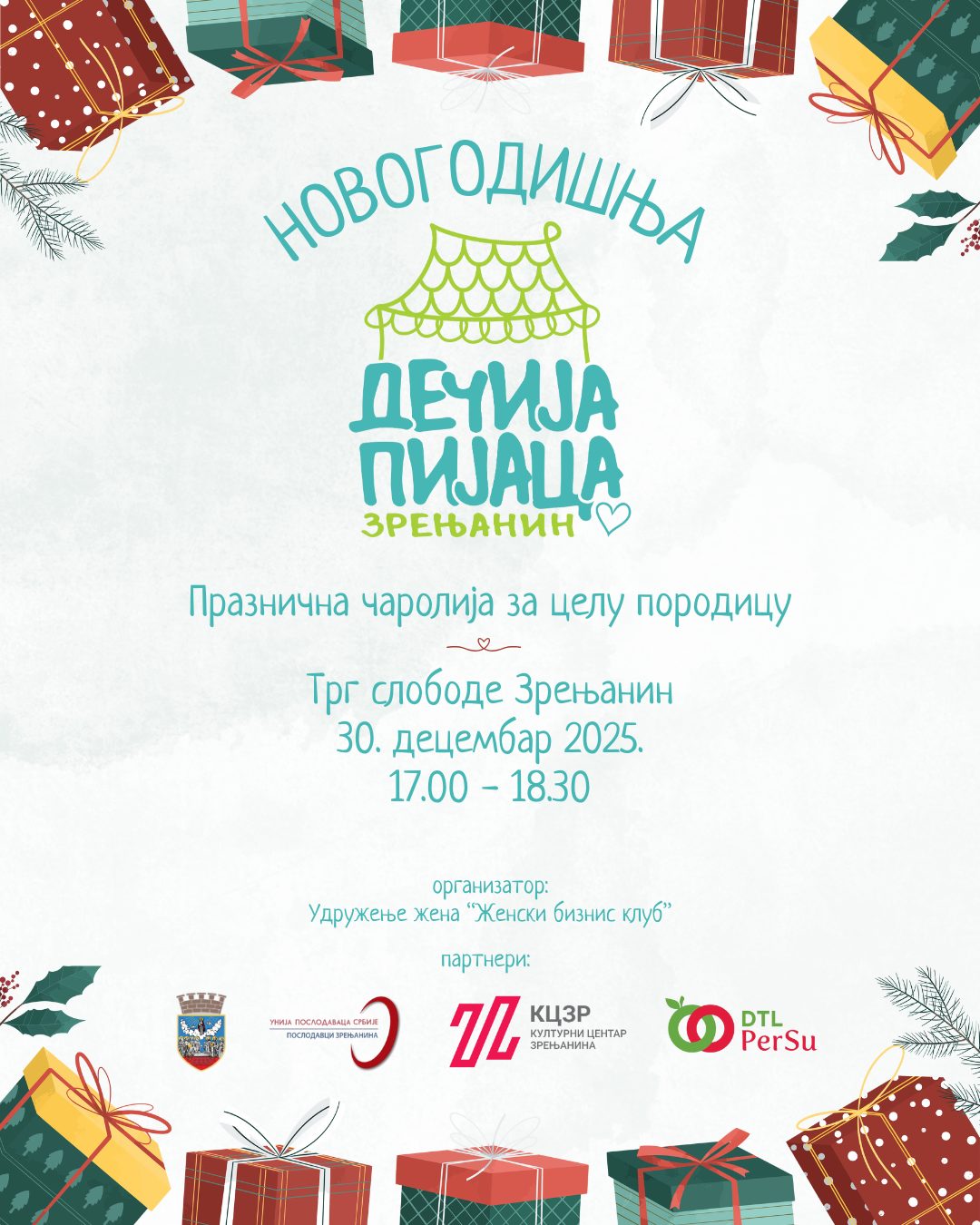 U okviru novogodišnjeg programa, u ponedeljak, 30. decembra, na Trgu slobode u Zrenjaninu biće održana novogodišnja Dečija pijaca, sa početkom u 17 časova. Ovaj događaj namenjen je najmlađima i osmišljen je kao prostor u kom deca mogu da pokažu svoju kreativnost, maštu i preduzimljivost u prazničnom ambijentu gradskog trga.