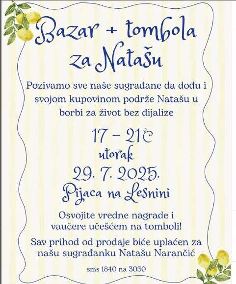 Porodica i prijatelji Nataše Narančić pozvali su sve sugrađane da pomognu njenom ozdravljenju tako što će učestovati u humanitarnom bazaru koji će se održati 29.07.2025. na pijaci na Lesnini sa početkom u 17:00 časova.