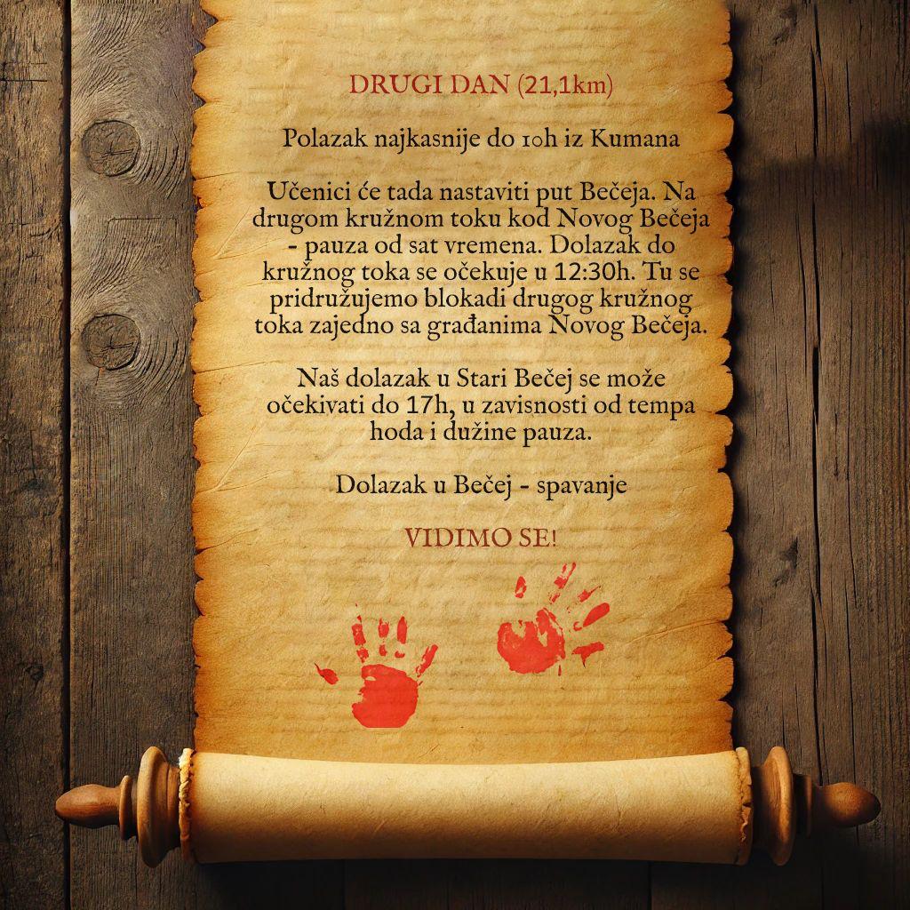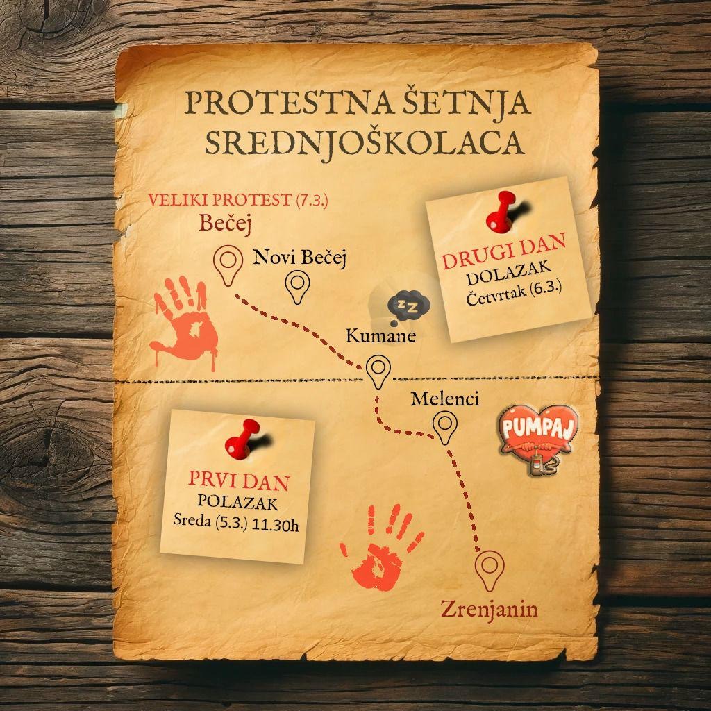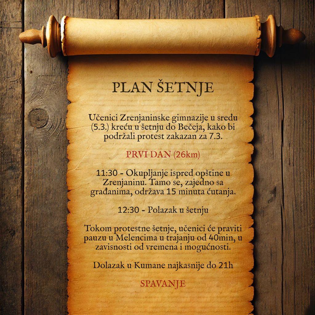 Zrenjaninski srednjoškolci sutra će krenuti pešaka put Bečeja kako bi se pridružili srednjoškolskom protestu „Banat, Srem i Bačka tri srca junačka“, šetnju će predvoditi gimnazijalci, a njihovi roditelji uputili su im motivaciono pismo koje prenosimo u celosti.
