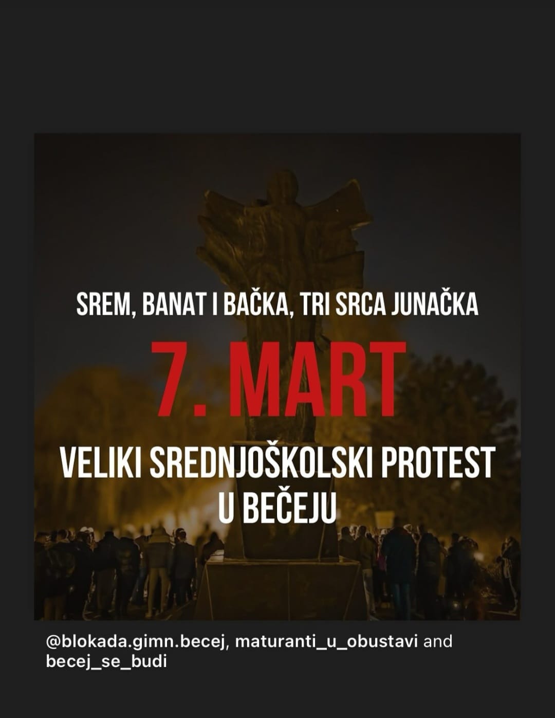 Želimo da vam poželimo srećan put i lake noge. Ne obazirite se, kad vam kažu da ste balavi i da nemate pojma– znate vi bolje od njih šta je u vašim glavama. Uvek praznoglaviji koriste takve izgovore da opravdaju svoju nesvesnost i neznanje. Ne obazirite se, kad vam kažu da se samo zezate i tražite razlog da ne učite – učite jednu od najvažnijih životnih lekcija, školske lekcije neće nigde pobeći. Uvek će vam to govoriti neškolovaniji koji su propustili ovu vašu važnu životnu lekciju. Ne obazirite se, kad vam kažu da ste zavedeni, zloupotrebljeni i plaćeni sa strane – vi i mi znamo da ste u ovome čistog srca i velike duše, da ne dugujete ikome bilo šta. Dugujete samo sebi da učinite nešto za sebe, za svoju normalniju budućnost. Ne obazirite se, kad vam prebacuju da vas dočekuju sa prasićima i muzikom – njih nesrećne niko tako u životu neće dočekati. A vas dočekuju tako nepoznati ljudi! O svom trošku, zato što oni tako žele, a ne zato što im je naređeno. Sveštenici izlaze ispred crkava i zvona zvone u vašu čast, ne u njihovu!