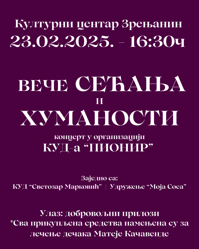 U Kulturnom centru Zrenjanina u nedelju, 23. februara održaće se humanitarni koncert „Veče sećanja i humanosti“. Nastupiće KUD „Pionir“, KUD „Svetozar Marković“ i udruženje „Moja sosa“ koji su ujedno, uz podršku Kulturnog centra Zrenjanina, i organizatori događaja.